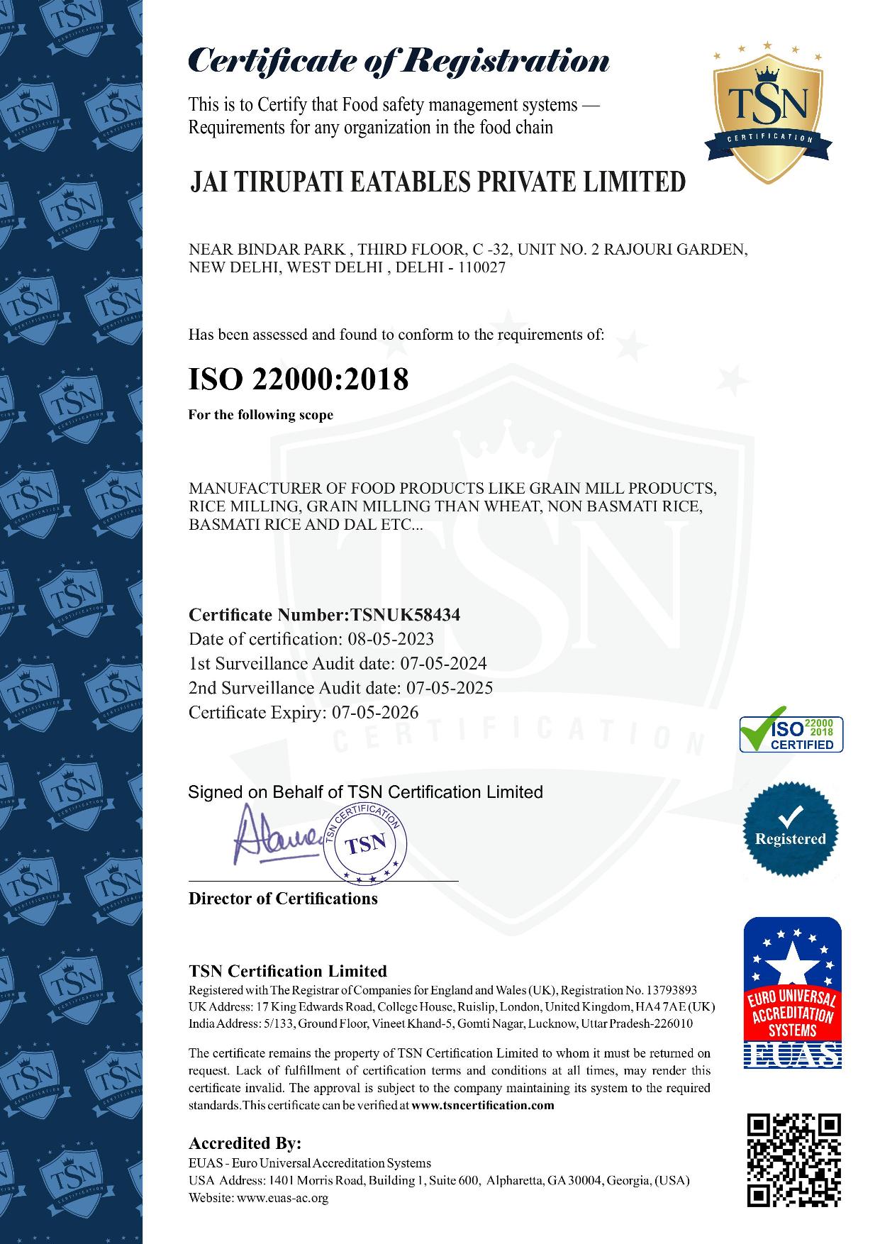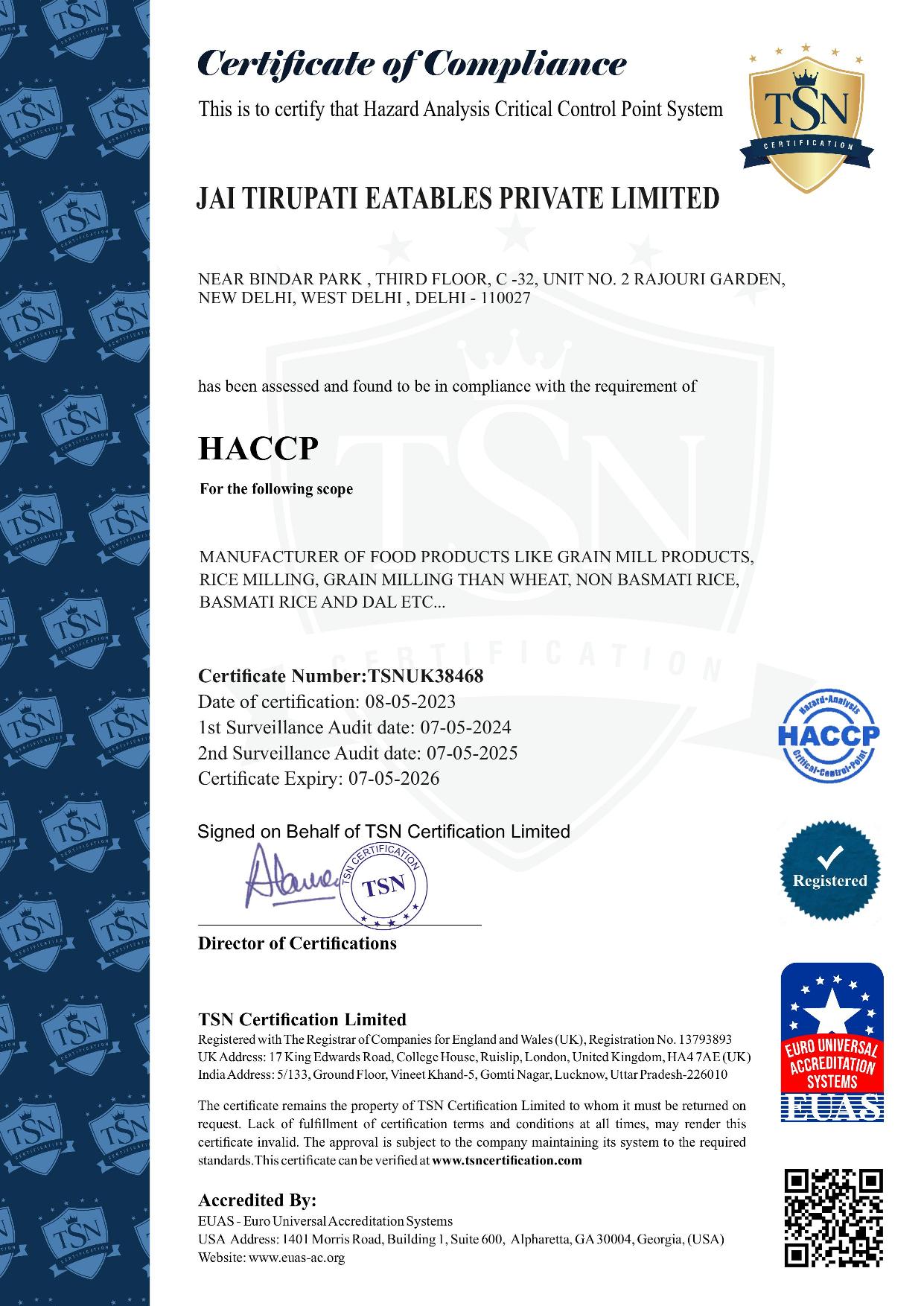 Firstly, Jai Tirupati Eatables is all about loyalty & quality and that's why we have access to the world's infinite customers. JTE has all the essential certifications which are vital for the export of rice throughout the world.